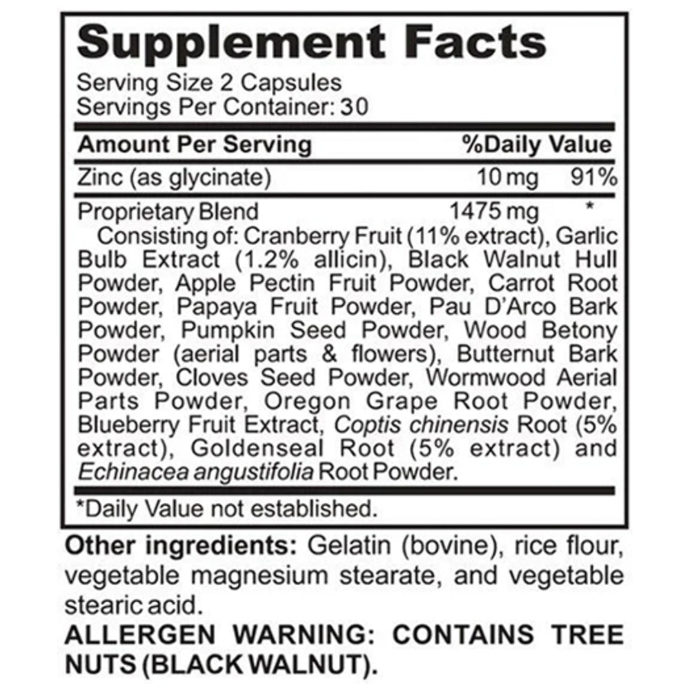 Parasite Cleanse is a potent broad-spectrum herbal GI detoxifying formula designed to support digestive tract fortification and microbial balance. It features concentrated botanical extracts and includes a wide range of traditional herbs commonly used for digestive and cleansing support.